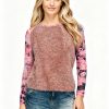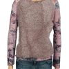 Rose long-sleeved sweater with a textured knit front and floral and script print sleeves.