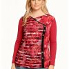 Red long-sleeved t-shirt featuring a bold floral and striped print on the torso,