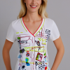 V-neck cotton t-shirt, featuring colorful abstract graphic designs.